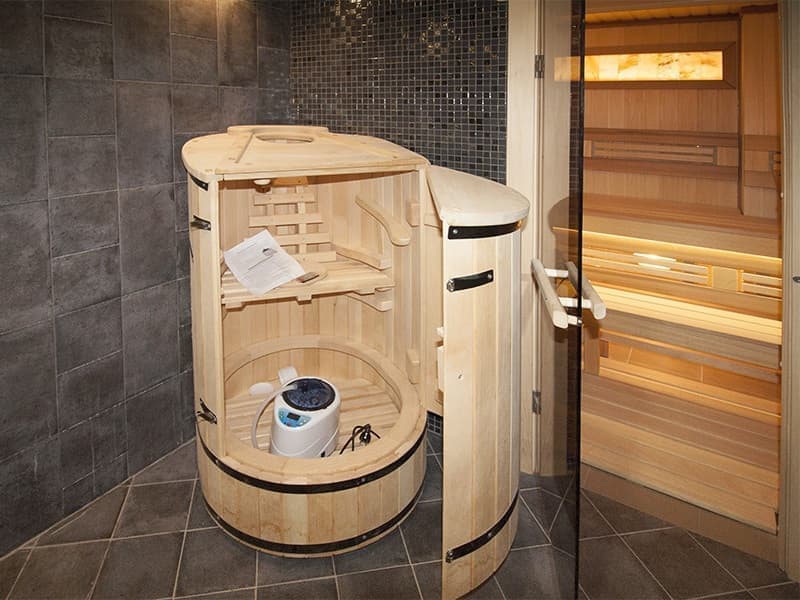 Миниатюрная парная имеет компактные размеры. Ее можно установить практически в любой комнате, где имеется электрическая розетка. Она не требует подключения к централизованным инженерным сетям: водопроводу и канализации. Для удобства внутри бочки размещается деревянная скамейка, регулируемая по высоте. Телу человека при процедуре удобно и комфортно. Голова находится снаружи, на нее не воздействуют высокие температуры. Это особенно важно для тех людей, которые плохо себя чувствуют в традиционной парной.