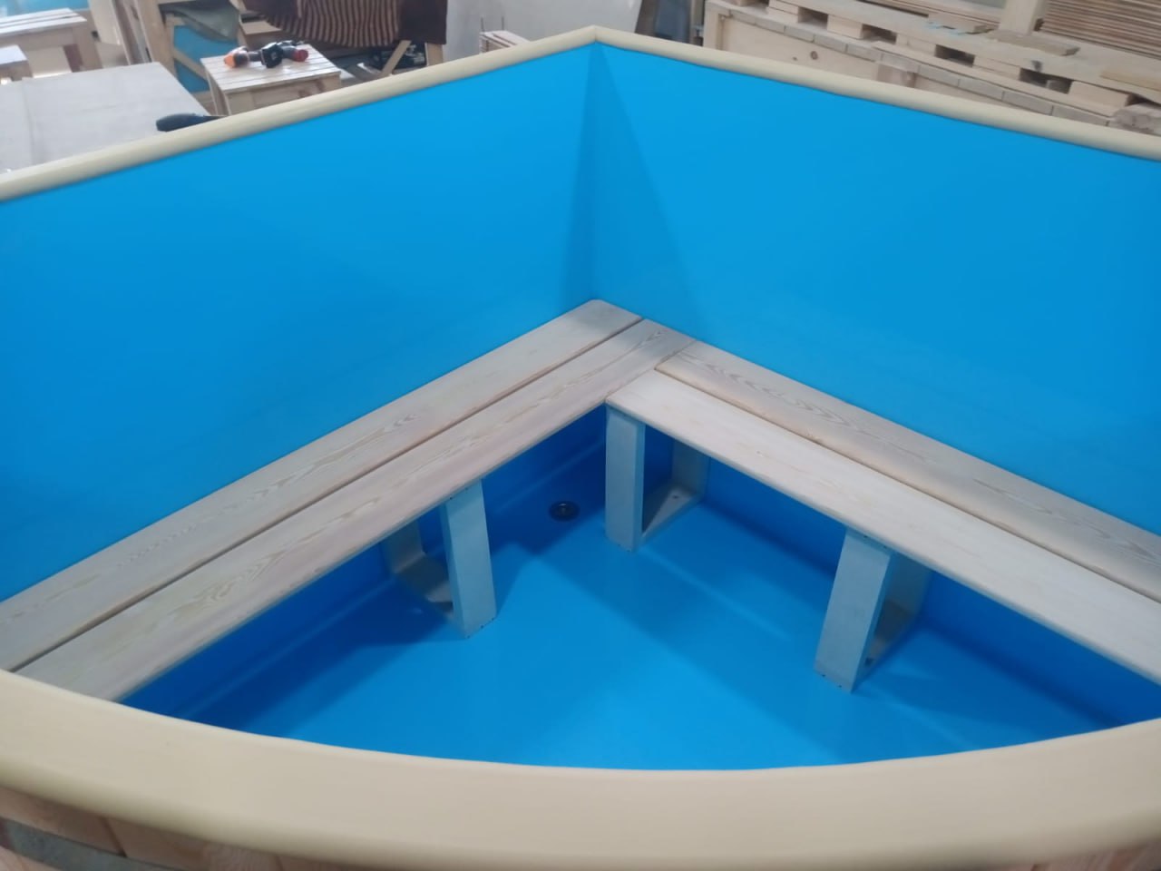 В купелях с пластиковой вставкой внешняя отделка обычно выполняется аналогично из качественной древесины, сохраняя эстетичность и природный вид, но при этом внутренняя часть остаётся долговечной и удобной в уходе.