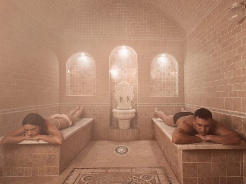 Хамам – очень мягкая и влажная парная. Температура достигает 45-55 градусов. Так как пар и температура в турецкой бане очень деликатны, посещать его можно почти всем: и беременным, и спортсменам с травмами, и людям с заболеваниями сердца и кровеносной системы (с разрешения врача). Противопоказан хамам при проблемах с венами и воспалениями на коже.